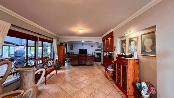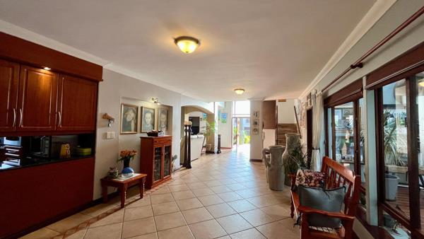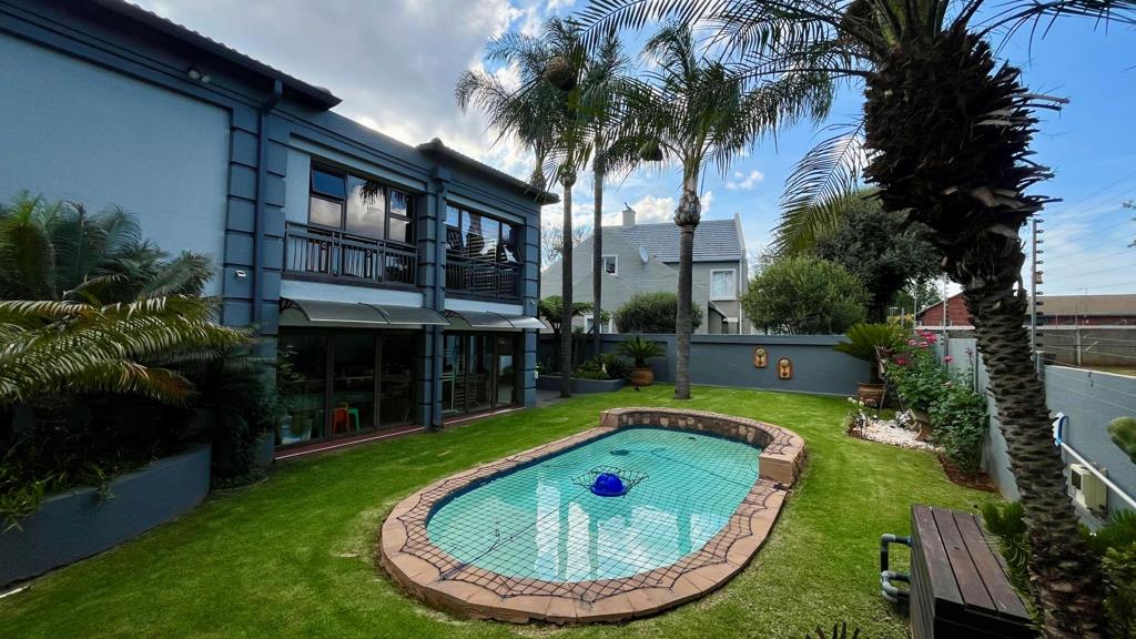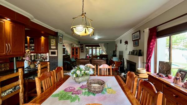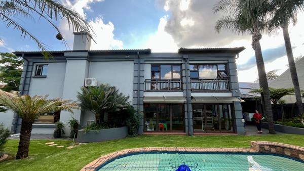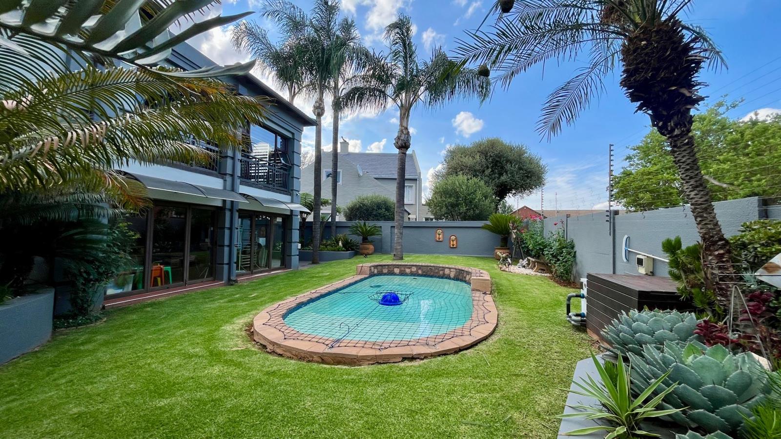 The modern kitchen features granite countertops, a gas hob, electric oven, pantry, and a separate scullery with space for three under-counter appliances. Aluminium stacking doors open from the living areas to a generous covered entertainment space, complete with a built-in gas braai, a gas oven, wooden deck with covered Jacuzzi. The lush green garden featuring tall palms and a sparkling swimming pool the ideal setting for year-round entertaining.