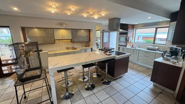 Step inside to a grand, spacious entryway featuring high ceilings and a striking circular staircase. The home boasts two generous lounges, two dining rooms, and a comfy family/TV room, ensuring ample space for everyone. The open-plan kitchen is a chef''s delight, complete with a large island, sleek marble-look countertops, built-in double ovens, and even a second kitchen for effortless entertaining.