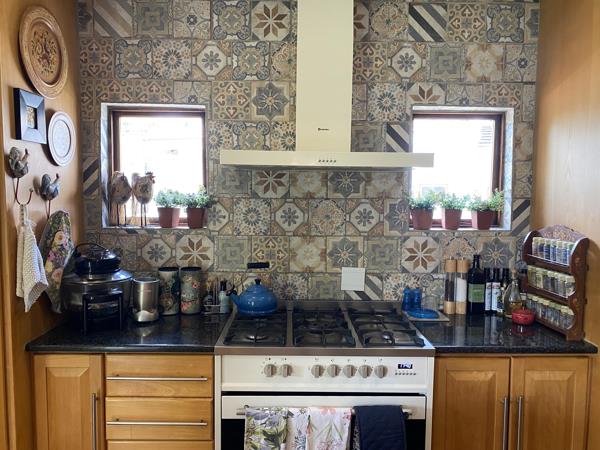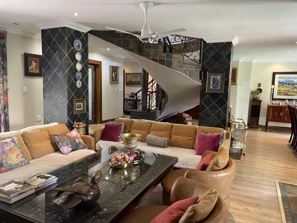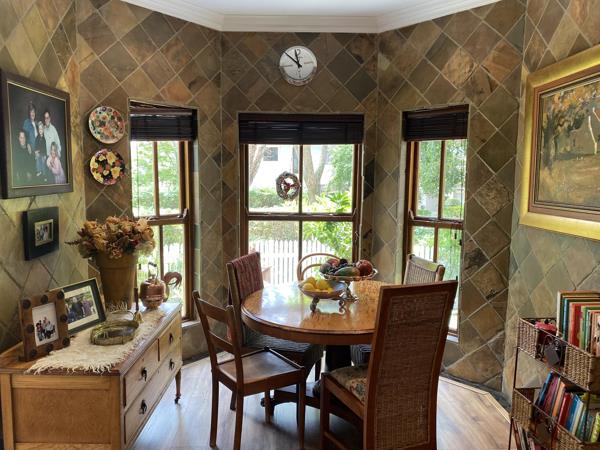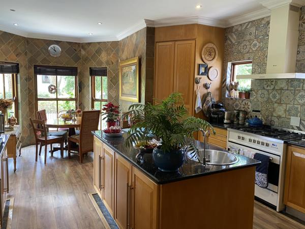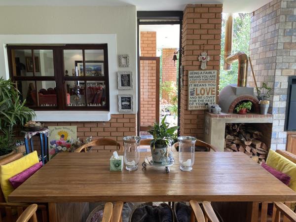 As you enter, you are greeted by a stunning Wrought iron staircase that sets the tone for the refined design throughout. The open-plan lounge and dining areas create an inviting atmosphere, complete with a cozy fireplace. The country-style kitchen is a chef''s dream, equipped with a gas hob, electric oven and a charming breakfast nook. This space flows effortlessly onto a covered patio with a built- in braai and pizza oven, perfect for entertaining while overlooking the landscaped garden.