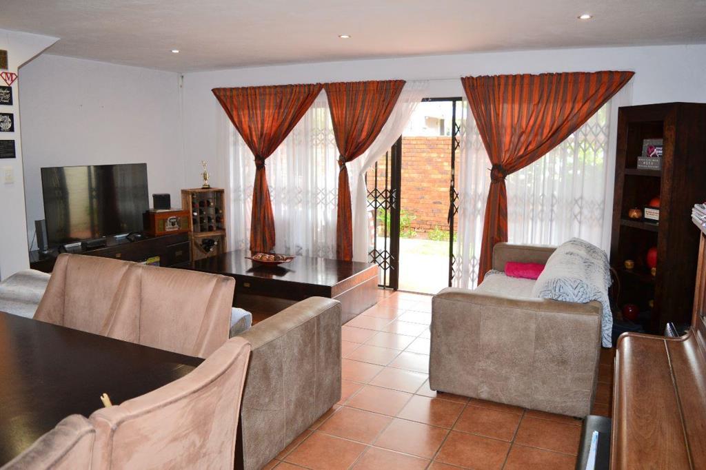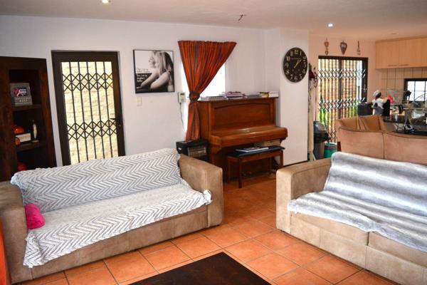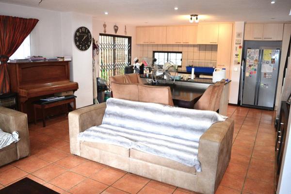 The living area is open plan to the kitchen with granite tops. The kitchen offers a beautiful island that divides the living area and kitchen. There is ample cupboard space. The living area walks out onto the patio with a built-in-braai that overlooks the quaint garden.