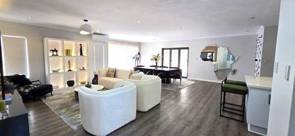 Spacious living and dining areas flow effortlessly into the modern kitchen, creating a welcoming open-plan space perfect for entertaining. Large stack doors lead out to a covered braai stoep, overlooking the garden and pool area.