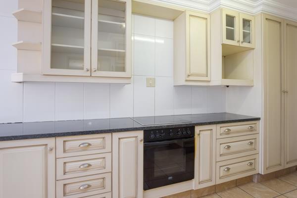 The modernised kitchen is fitted with granite finishes, ample cupboard space, and room for a double fridge/freezer. It conveniently opens to a private drying courtyard with a washing line and basin, ensuring practicality and comfort in everyday living.