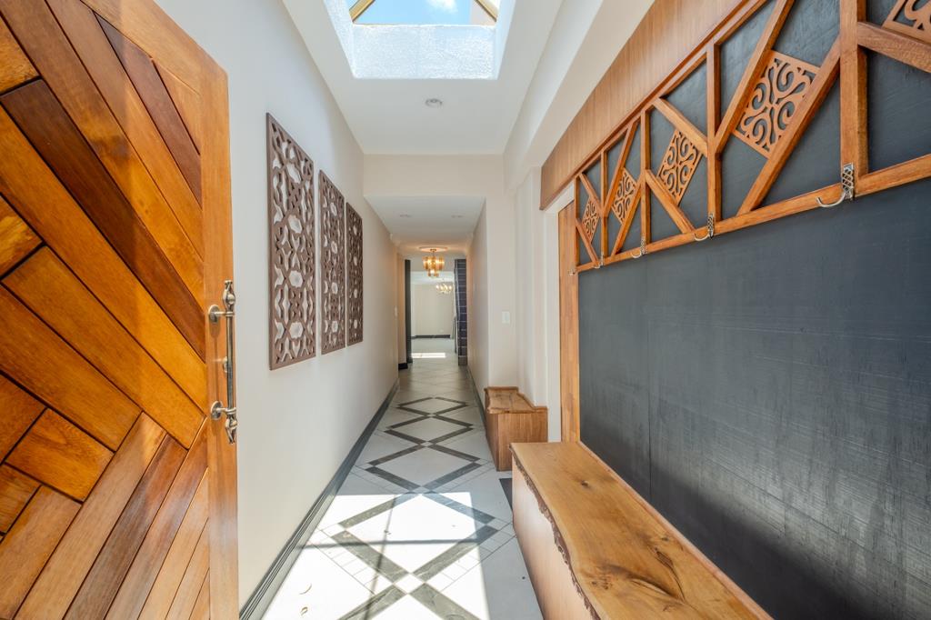 Accommodation comprises four generously sized bedrooms, with the main bedroom, on the ground floor, offering the privacy of an en-suite bathroom and a sliding door leading to the pool. The home extends its living spaces outdoors with sliding doors leading to a beautiful patio and a built-in braai, perfect for al fresco dining. Enjoy leisurely days by the private swimming pool with a manicured garden, or take in the scenic views from the balcony. There is also a lush tropical communal garden featuring stunning water features with ducks.