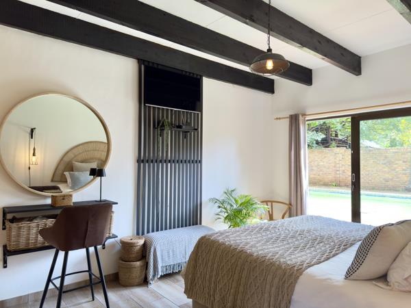 The main bedroom is a sanctuary of its own, featuring a newly renovated en-suite bathroom and aluminium sliding doors that open directly onto the pool area, creating a tranquil retreat.