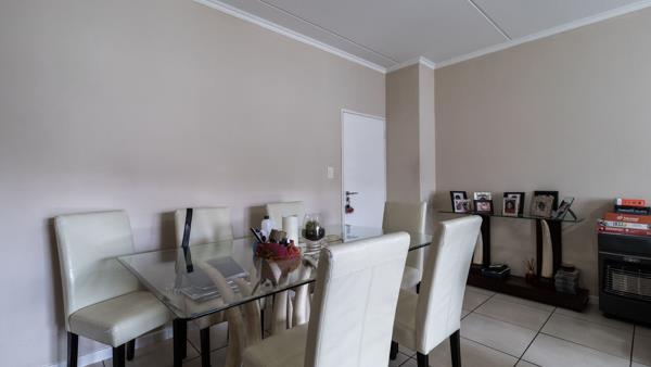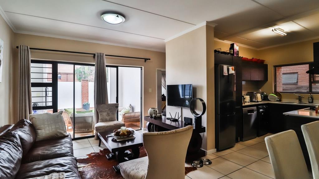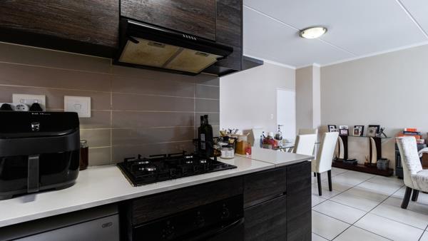 The open-plan living and dining area flows seamlessly into a contemporary kitchen, featuring a sleek gas stove, ample cupboard space, and modern finishesideal for those who love to cook and entertain. Step outside to your private garden and covered patio, complete with a built-in braai and extra storage, perfect for relaxing or hosting guests.