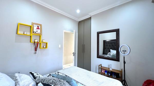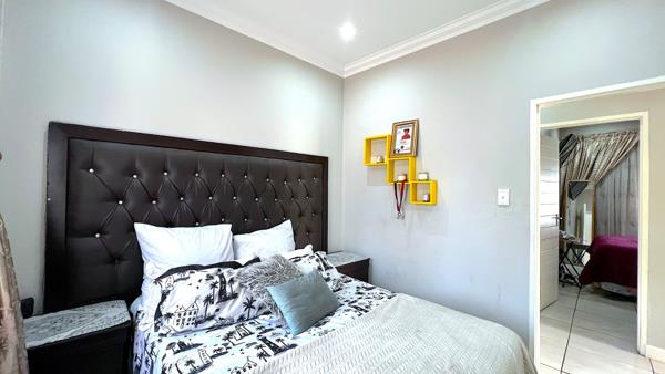 Upstairs, the spacious main bedroom offers a peaceful retreat with additional built-in cupboards and a luxurious en-suite bathroom. Two additional bedrooms, each with built-in wardrobes, share a well-appointed full bathroom. For added peace of mind, discreet clear bars are fitted to upstairs windows without compromising the homes aesthetic.