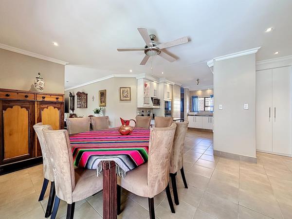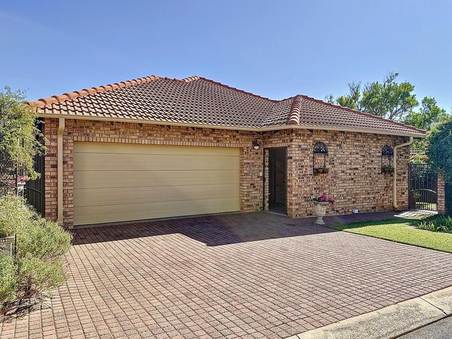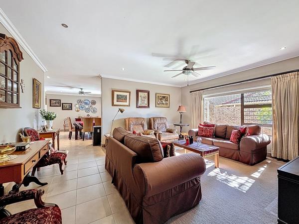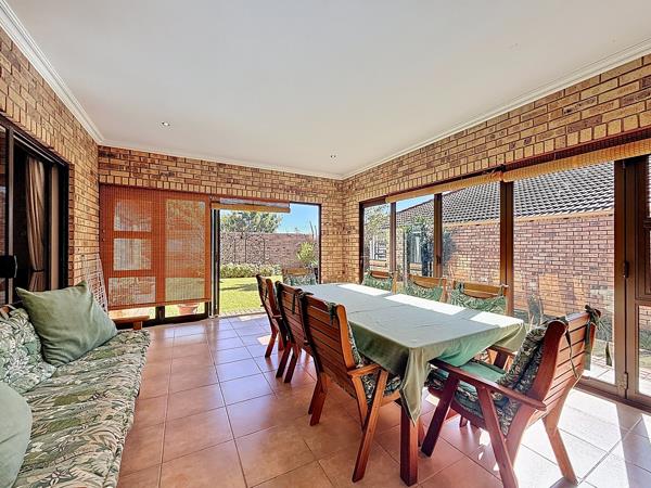 The three bedrooms are very spacious, easily accommodating double beds. There are two full bathrooms, with one en-suite. The kitchen is fitted with a double oven and easily accommodates two fridges. Having the scullery and laundry separate keeps the kitchen impeccable. There is a direct entry from the garage to the home. The garage offers a space for tools, etc, and many built-in cupboards to house all the extras. The dining area leads off the kitchen and onto an enclosed patio surrounded by stack doors and a built-in gas braai.