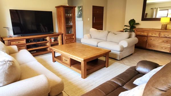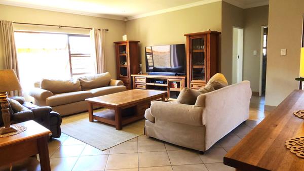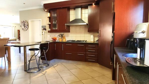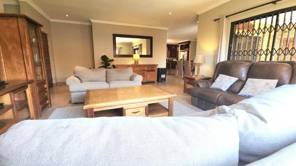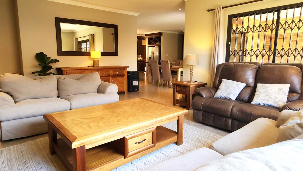 Spacious Open plan living/dining room areas leads onto a lovely extended covered Patio with a built-in braai into a wrap around garden.