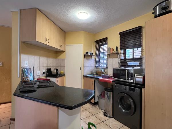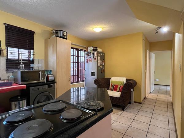 The ground floor hosts dining and TV room, kitchen, two bedrooms and a bathroom. Then there is also a patio with a built-in braai. From the patio you step into a fairly spacious garden.