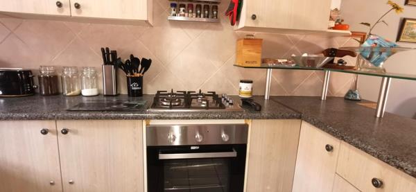 An open plan kitchen with ample cupboards, under counter gas stove, a breakfast nook and space for two appliances.