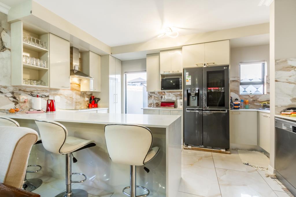 Modern open plan kitchen fitted with ceasar stone counter tops and granite splash backs, a pantry cupboard, space for a double door fridge and two additional appliances.