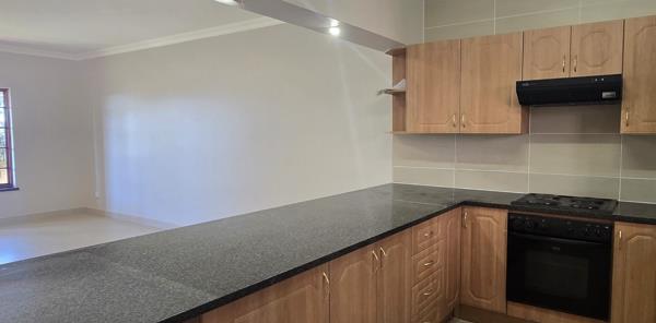 -Open-plan kitchen with 2 water inlets, space for 2 other appliances, spacious cupboards, granite tops, stove with hob and oven, and extractor fan