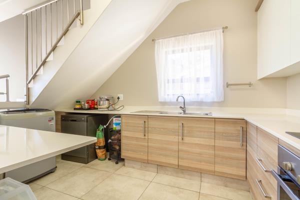 The kitchen is fitted with quartz countertops, space for a double-door fridge and two under counter appliances. A guest bathroom is conveniently situated on the ground level.