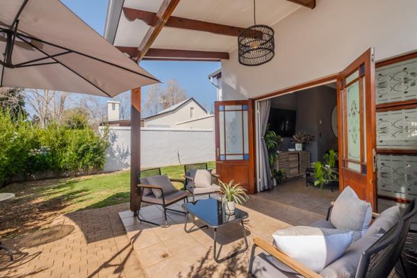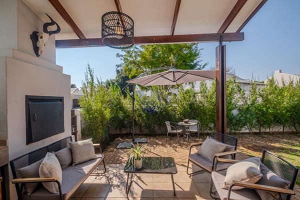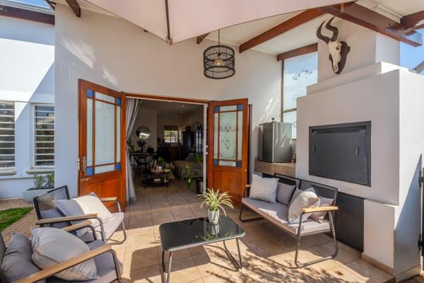 Step inside to find an open-plan lounge and dining area, with French doors leading out to a covered patio featuring a built-in braai, perfect for entertaining. The large, pet-friendly garden offers a serene outdoor space ideal for children, pets, or simply relaxing in nature.