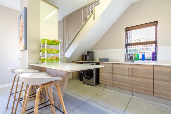 Upstairs features all 3 bedrooms, the main bedroom with built-in cupboards, extra storage, blinds, air conditioning, TV point, and a modern en-suite bathroom (large shower, toilet, and double basins)