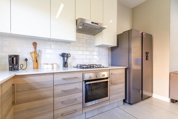Open plan kitchen with quartz counter tops and ample cupboard space, including space for a double door fridge