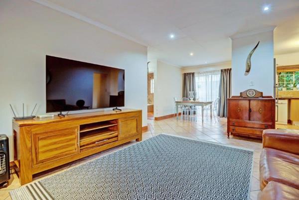 Spacious, tiled, open plan living areas are flooded with light from the large windows. The lounge area is spacious enough for comfortable couches and occasional chairs. Seat up to eight people in the dining room area. The layout of the living area is ideal for entertaining with a sliding door that opens to the covered patio with built in braai and beautiful, low maintenance garden.