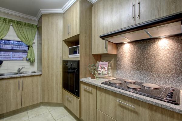 Enjoy cooking in this modern, open plan kitchen - fitted with light oak wood finished melamine cupboards, granite counter tops, a breakfast nook, built in stove, eye level oven, extractor fan, pantry cupboard and space for all your major appliances.