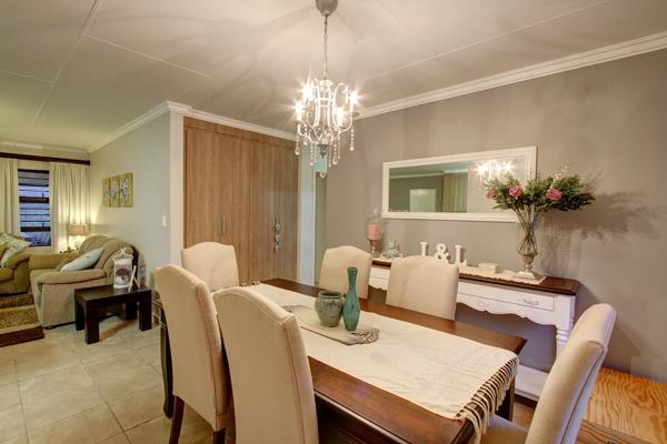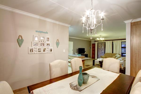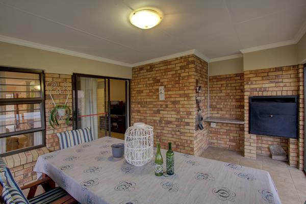 The open plan lounge and dining room open to the enclosed covered patio with built in braai & beautiful, wrap around garden. The ideal place to entertain your friends and family all year round. The lounge area is spacious enough for comfortable couches plus occasional chairs. The dining room can accommodate an eight eater dining room table.