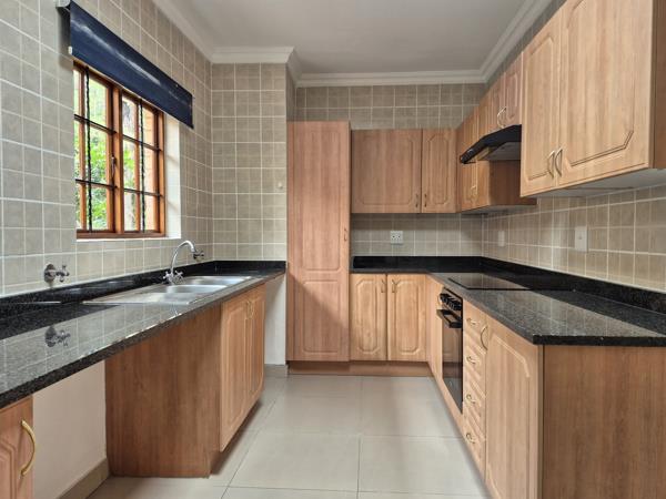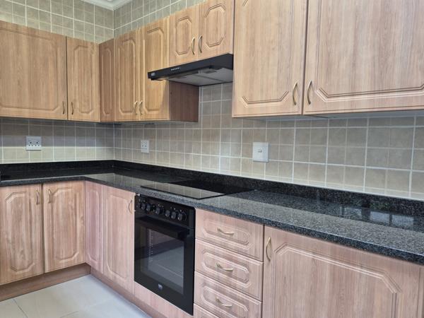 A separate kitchen, equipped with granite countertops, ample cupboard space, an electric stove with oven & extractor fan, plus water inlets accommodating a dishwasher and washing machine.