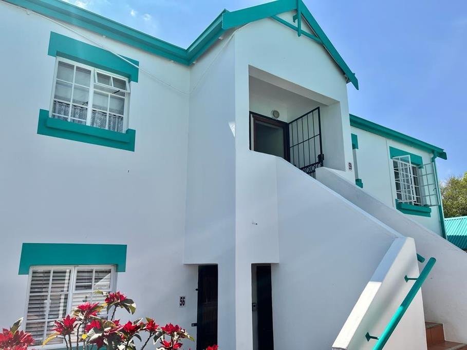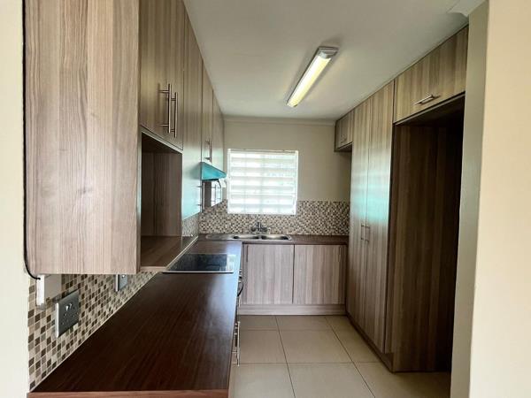 The kitchen is open plan with a pantry , double fridge space and ample cupboard space. The open plan living area has enough space for a small dining table and a lounge suite. The balcony overlooks a garden. A small garden can be enjoyed with own private outside washing line.