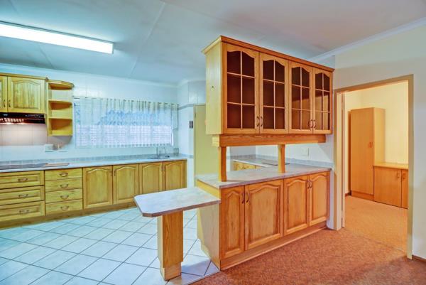 Well-equipped kitchen with ample cupboard space and breakfast nook, leading into an open-plan lounge and dining area