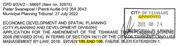 On the properties are the following features, a 250 GB fibre line is already connected to the site and a borehole on Erf 195, which can be utilized for the development.