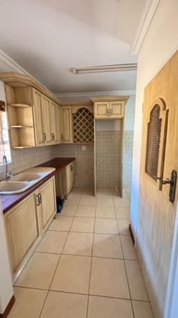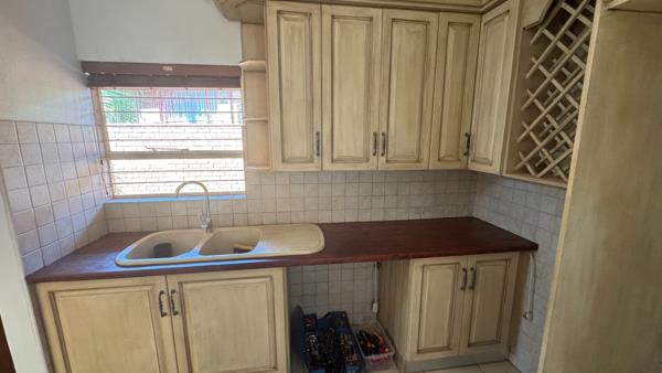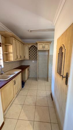 The home offers a seamless flow of open-plan living areas that lead to a fully enclosed braai roomideal for year-round entertaining. The kitchen is impressively large, featuring ample built-in cupboards, warm wood countertops, a pantry, and a combined laundry and scullery area.