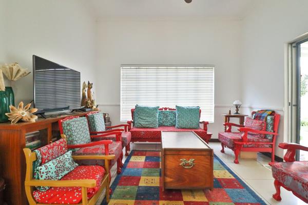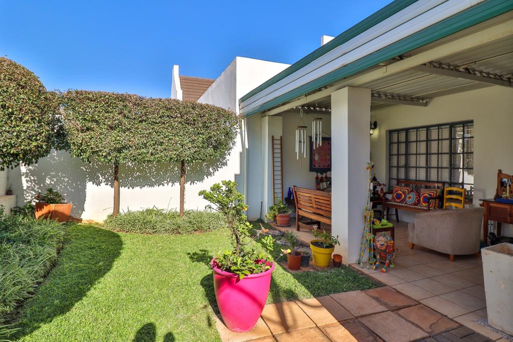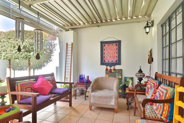 The lovely patio overlooking a well maintained garden with a sparkling blue pool, completes the picture!!