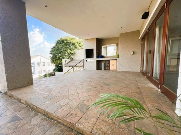 Large covered patio with built-in braai, overlooking a private swimming pool perfect for entertaining