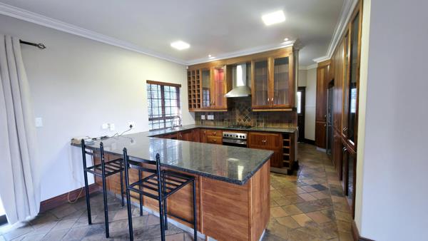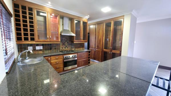 Downstairs features a sleek kitchen with granite countertops and a separate scullery, flowing into the open-plan dining and living areas. A private home office with built-in cupboards makes working from home effortless, and a large storage room with extra cupboards keeps your space organised.