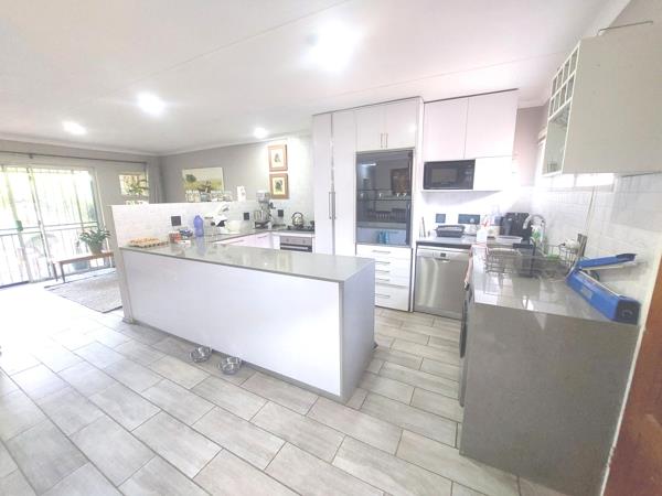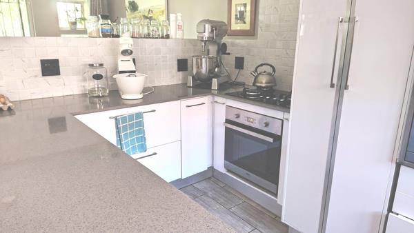 The remodelled kitchen is open plan with the dining- and lounge area. Kitchen has a pantry, an oven with gas hob, and space for a washing- and dish washing machine. (The owner has added and extra double electric oven in the space of fridge which could be removed and replaced again with fridge).The dining room area has space for extra fridges. The lounge opens up with sliding door to under roof patio and big garden.