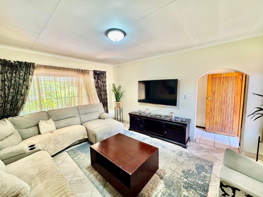 A sliding door opens to a patio beneath a louvered awning, ideal for summer days, overlooking a large, private gardenperfect for braai days.