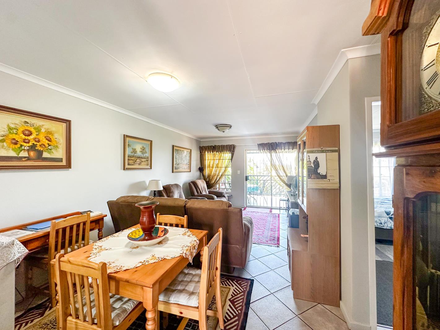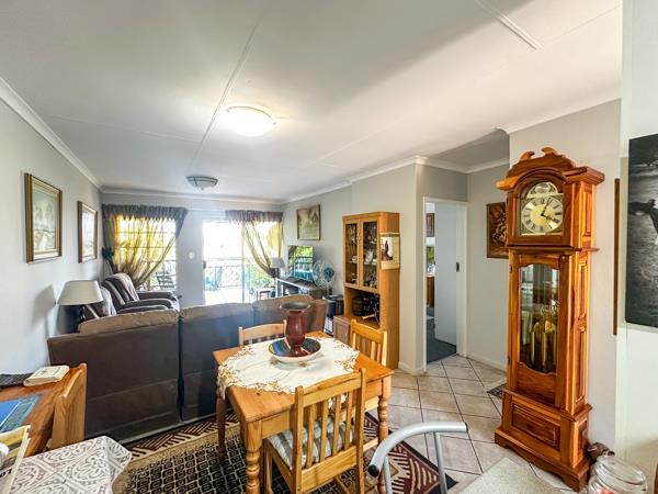 The spacious living area flows seamlessly from the kitchen and opens through sliding doors onto a large balcony patio, ideal for relaxing or entertaining. To the right of the apartment, youll find two bright and airy bedrooms, each fitted with built-in cupboards. The separate bathroom is equipped with a bath, shower, basin, and toilet, providing both functionality and comfort.