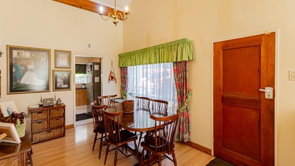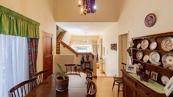 The open-plan dining and lounge area flows effortlessly onto a covered patio, ideal for relaxing or entertaining while overlooking the established garden and tranquil water feature.