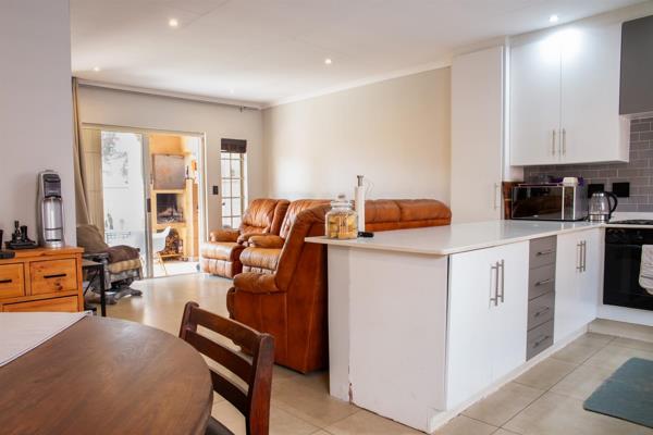 The spacious lounge boasts glass sliding doors that open onto a large covered patio with a high wooden-beamed ceiling and a built-in braai, offering an ideal setting for entertaining or relaxing while overlooking the well-kept garden, maintained by the Body Corporate.