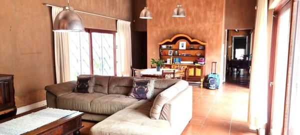 DUEL MANDATE! Unusual home with extra spacious living areas. The lounge has a big fireplace, dining big for a 10 seater set with sliding doors on both sides, The kitchen is open plan with space for a dining table adjoining the inside braai room space for lounge set. 3 spacious bedrooms, 2 bathrooms, laundry room, full workers room and bathroom. Spacious study ideally for work from home with built-in shelves. Upstairs a huge loft ideal for your student space to add a bathroom, or office from home. Self-contained flatlet consists of lounge, small kitchen, bedroom & bathroom. Parking for 2 vehicles with private entrance, with rental of R4 600pm. The house has a pool and a pool-house, ideal to store your pool chairs and pillows as well as a space for the artist in you. Water tank. The house is fitted with 15 solar panels as well as a borehole. Gas geysers for the bathrooms. The property has access to a greenbelt with flowing water, grass and lovely gardens cameras added in the green belt. Double garage. To top it off, the house is situated in a quiet cul-de-sac. Enough said...call Gerda to view this entertainers delight!