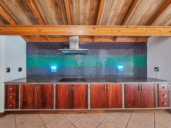 The entertainment area offers enough room for a large lounge, a separate dining area, and includes a built-in bar overlooking the swimming pool through wide scatter doors. Adjacent to the pool is a small gym and a boma area with a built-in braai, ideal for outdoor relaxation and evening gatherings.