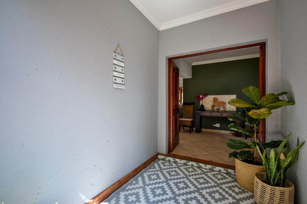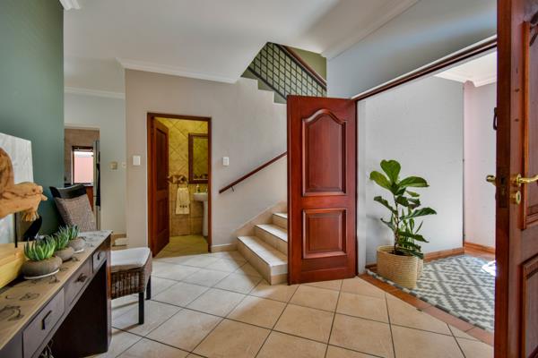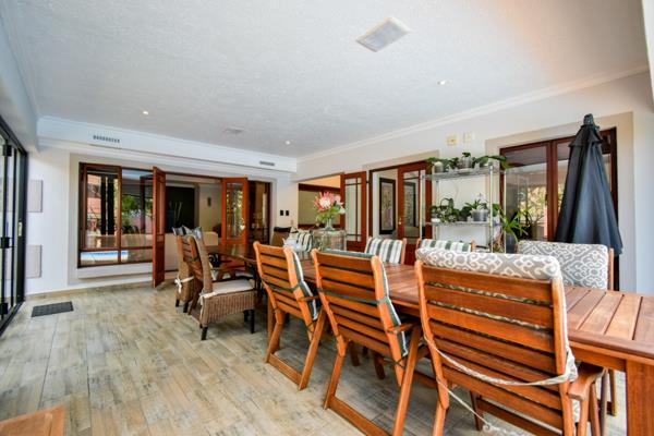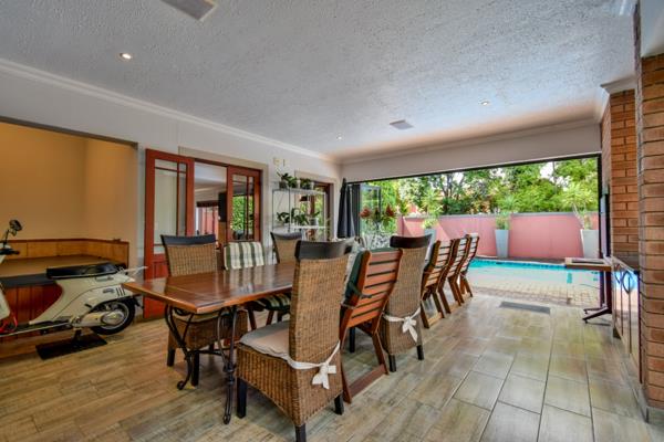Upon entering, you are welcomed by a bright lounge featuring bay windows and doors opening onto the patio. The TV room also flows seamlessly to the patio, enhancing the homes indooroutdoor living appeal. The spacious patio is fitted with a jacuzzi, built-in braai, and folding doors, making it the perfect setting for entertaining guests.