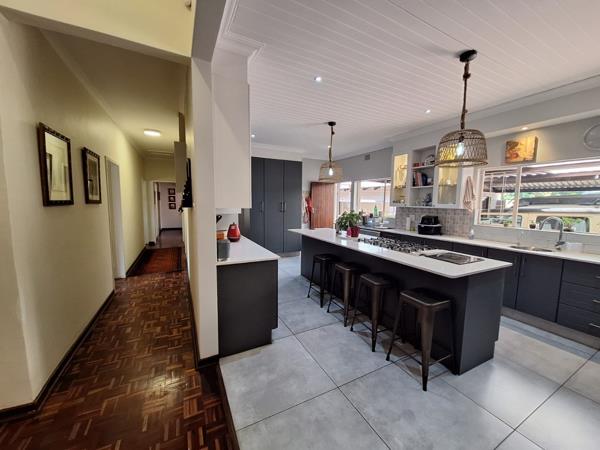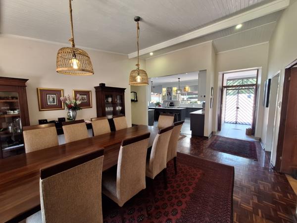 The dining room is spacious with immaculate Rhodesian teak parquet flooring that flows through the passage and bedrooms.