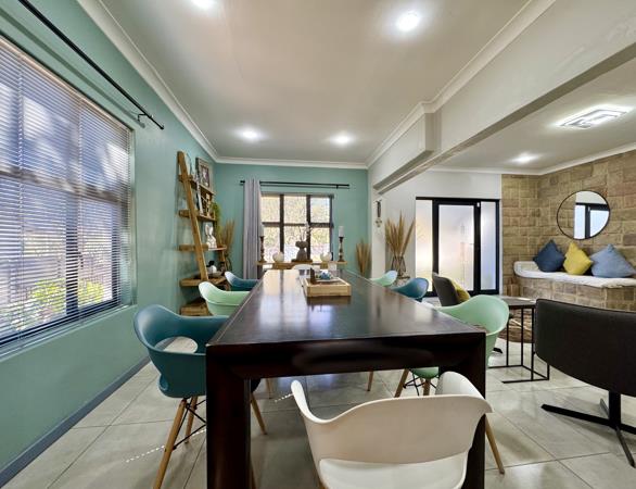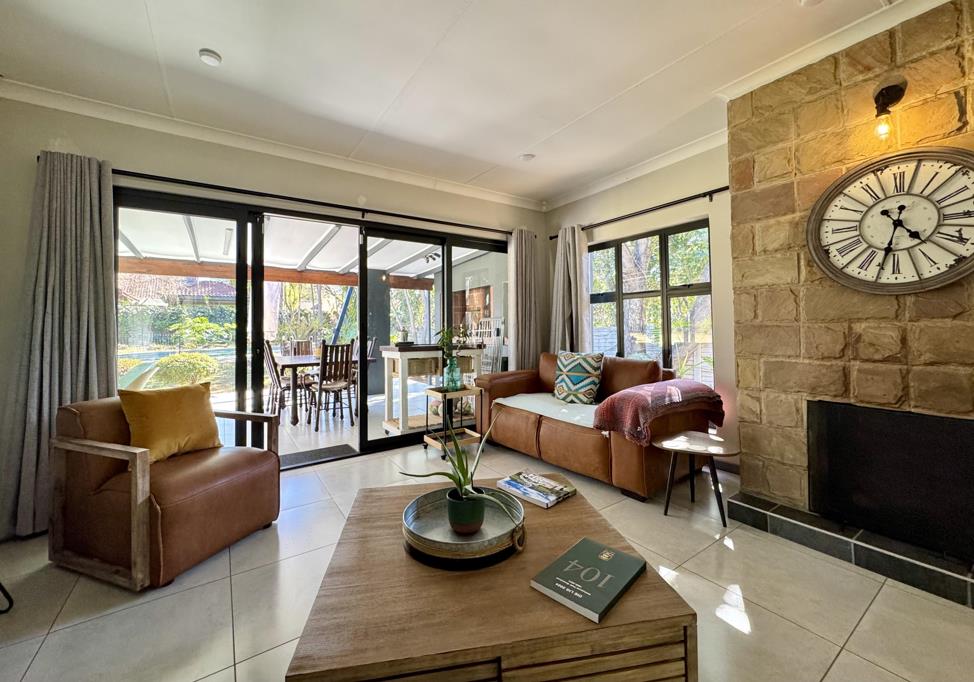The newly designed open-plan kitchen seamlessly integrates with the dining area, making it ideal for entertaining. A cozy lounge, complete with a wood-burning fireplace, flows effortlessly to the outdoor patio. Enjoy al fresco dining on the covered patio, which features a built-in braai and stunning views of the lush garden and expansive pool.