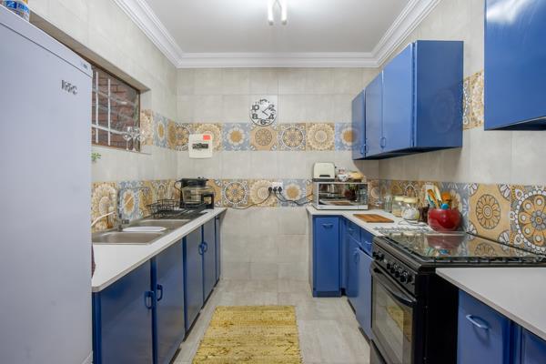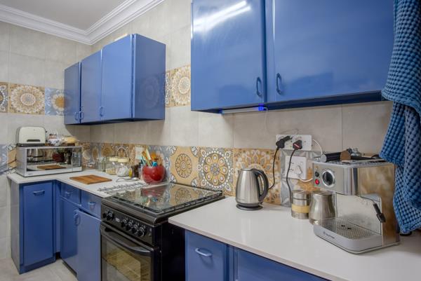 The delightful colour filled kitchen includes decorative wall tiles, Caesarstone counter tops, generous cupboard space and a gas stove.