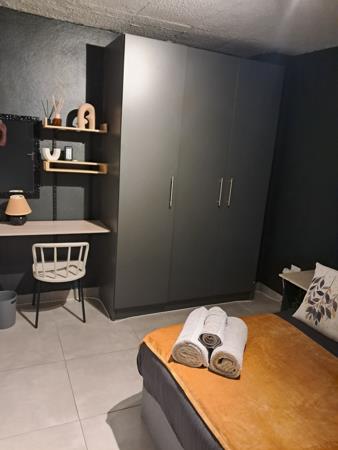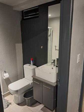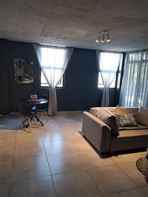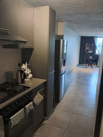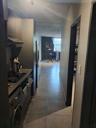 Discover modern living in this stylish 1-bedroom, 1-bathroom apartment located in a secure complex in Lynnwood Ridge, Pretoria. Boasting a contemporary architectural design with a dark facade and well-maintained landscaping, this property offers excellent kerb appeal. The 57 sqm unit features an open-plan layout, seamlessly connecting the lounge, dining area, and a sleek galley-style kitchen. The kitchen is equipped with modern grey cabinetry, integrated appliances including an oven, hob, extractor fan, and a full-size refrigerator, complemented by durable tiled flooring throughout.