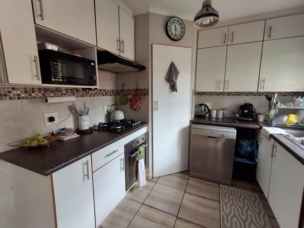 Step inside to discover a modern and inviting interior. The spacious dining area, featuring stylish decor and ample natural light from a large window, flows seamlessly into the lounge. The compact yet functional kitchen boasts white cabinetry, dark countertops, a tiled backsplash, and modern appliances including a gas hob, microwave, dishwasher, and a refrigerator, complemented by a pantry.
