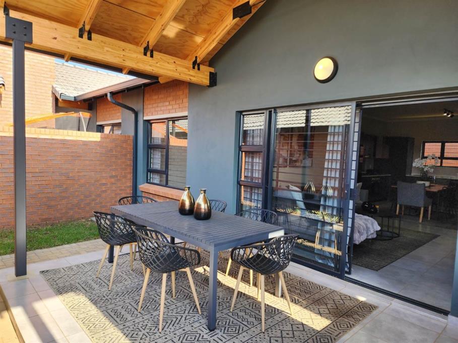 -Living area opens to a patio with built-in braai, surrounded by a small garden