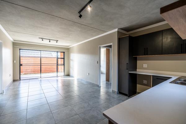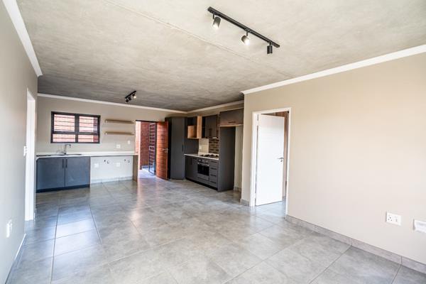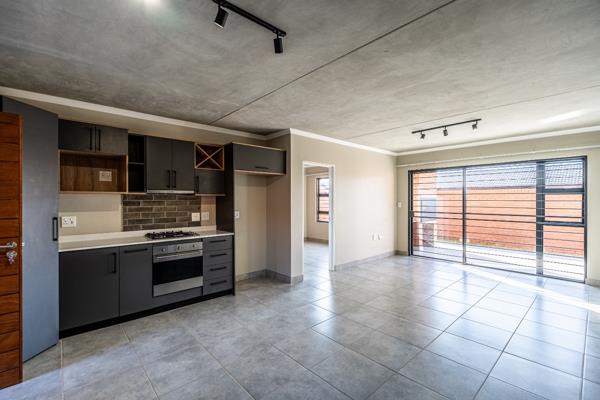 Step inside to an expansive 126 sqm of open-plan luxury, where the lounge, dining area, and kitchen seamlessly converge. The state-of-the-art kitchen boasts sleek dark cabinetry, pristine light countertops, a built-in oven, and a gas hob, all illuminated by stylish track lighting. Chic grey tiled flooring and neutral walls complement a distinctive exposed concrete ceiling, creating an urban-chic ambiance.