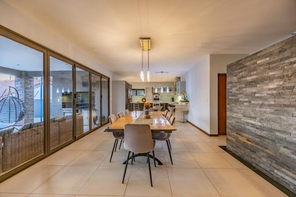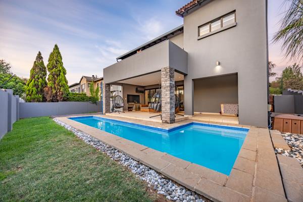 Perfect for entertaining, the home features multiple outdoor living spaces, including a dedicated entertainment area with a built-in gas braai. Overlooking a sparkling swimming pool, this space is ideal for gatherings with family and friends. A manual irrigation system keeps the garden low-maintenance, while the downstairs guest toilet and spacious study add both practicality and versatility for modern living. The thoughtful design ensures every area of the home balances style with function.