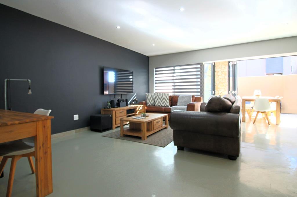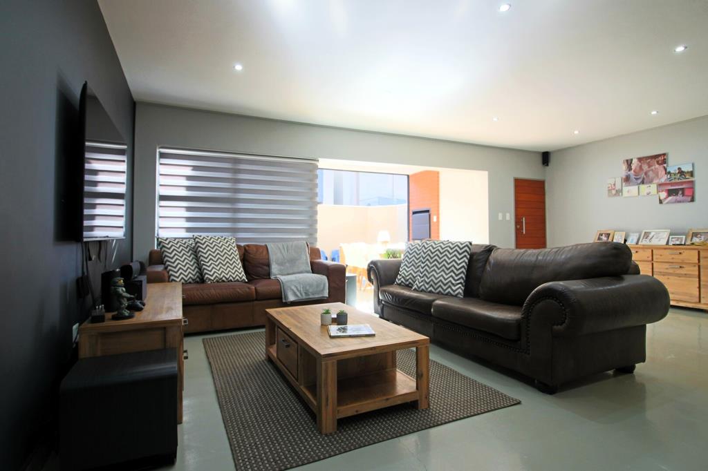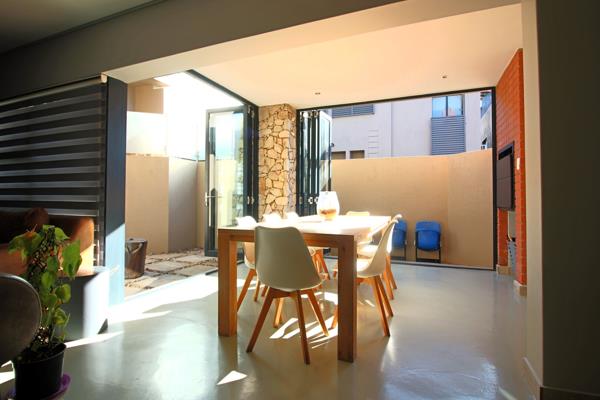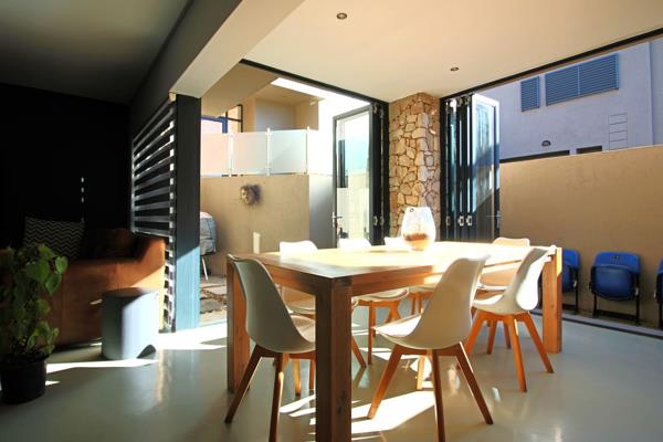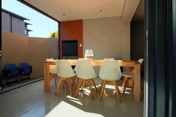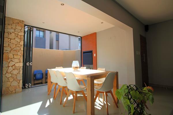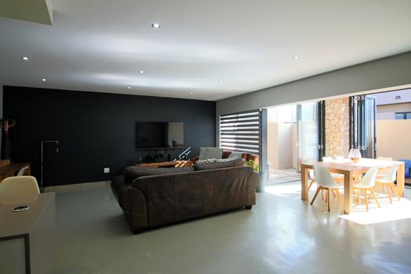 The living areas seamlessly flow into an indoor braai room, which opens with folding doors to the outdoor living space.