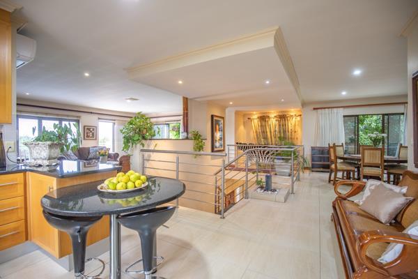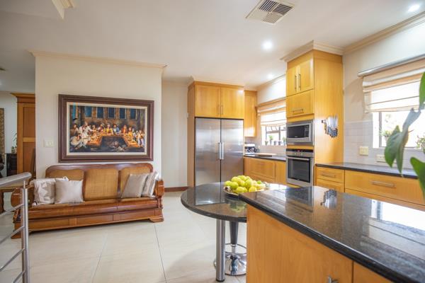 Step inside to an expansive open-plan design, where an elegant entrance hall ushers you into a world of seamless living. The gourmet kitchen is a culinary masterpiece, boasting dark granite countertops, light wood cabinetry.Complemented by a practical scullery and pantry. This culinary hub effortlessly transitions into the sophisticated dining room, a comfortable lounge, and a dedicated family TV room. A chic built-in bar and a cozy fireplace enhance the ambiance, while integrated air conditioning ensures year-round comfort.