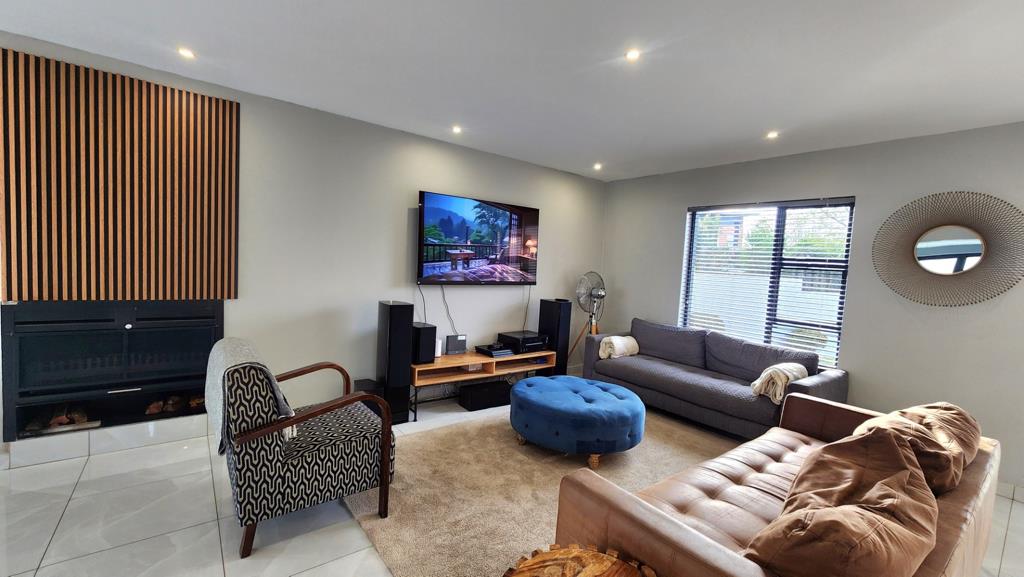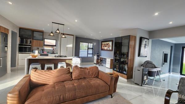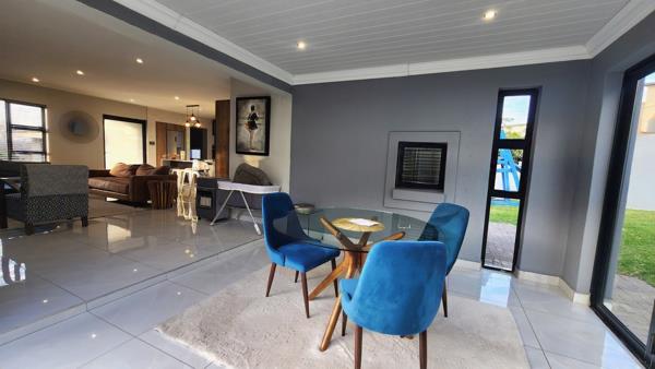 The family room with a cozy fireplace leads seamlessly to an undercover patio/dining area with a built-in braai perfect for entertaining!
